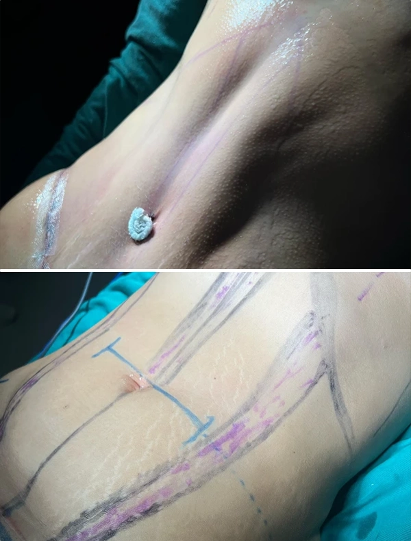 Redefinição abdominal com retirada de pele, amarração muscular e contorno suave.